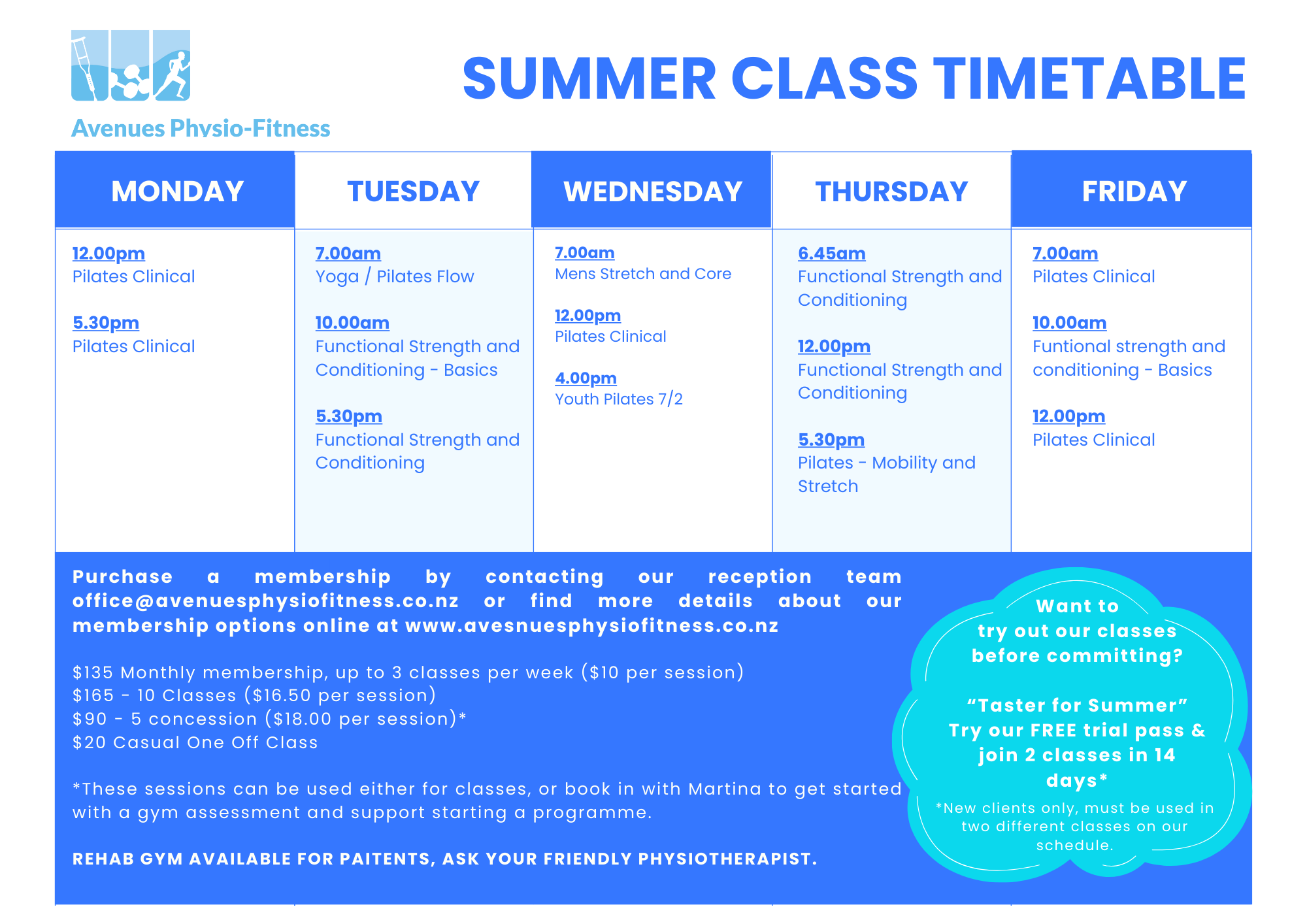 Avenues Physio-Fitness is committed to providing a quality, safe and enjoyable class experience. Our class numbers are limited to 8 people. Please ensure that you book ahead as these classes are popular and fill up fast.